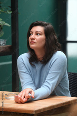 Natural light portrait of a mid-adult woman sitting at an outdoor café table, thoughtful expression and calm mood, casual sweater, authentic candid moment with soft background and natural color tones.