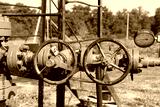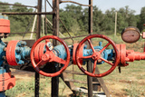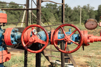 Industrial valves. Oil pump rig, Oil well wellhead equipment. Hand valve with handwheel for opening and closing the flow line