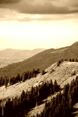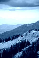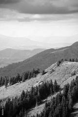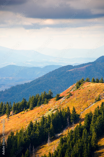 fir trees on a meadow down the hill. coniferous forest in carpathian mountains of ukraine. steep hillside on sunny day in early autumn