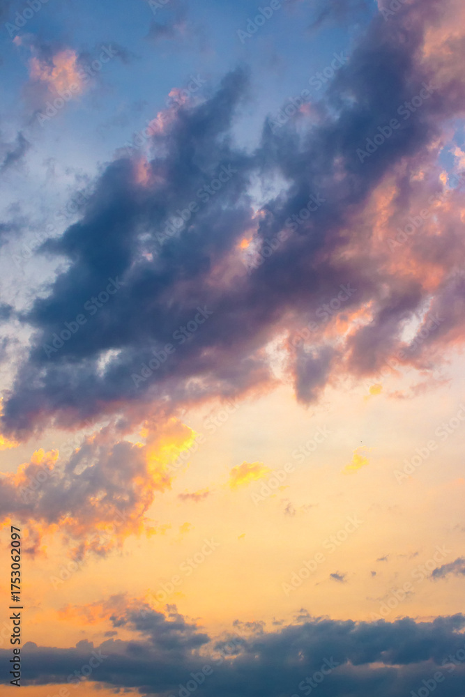 dark cloudscape at sunset. orange-purple clouds on a yellow-blue gradient of sky in evening light. dramatic weather change. wind forecast background. place for copy space. narrow telephoto shot