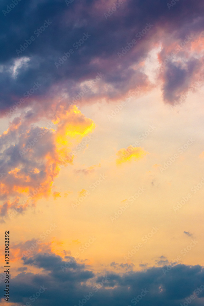 dark cloudscape at sunset. orange-purple clouds on a yellow-blue gradient of sky in evening light. dramatic weather change. wind forecast background. place for copy space. narrow telephoto shot