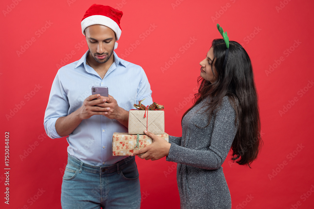Family celebrate Christmas woman in deer headband holding gifts and man in Santa hat browsing online