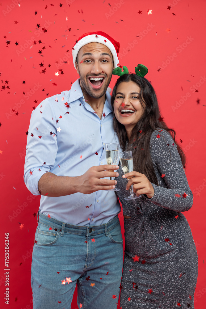 Merry couple man and woman wearing Santa hat and deer headband clinking wineglasses with champagne