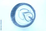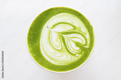 Top view of green tea matcha latte with intricate white foam art in paper cup on clean white background. Close up. Shallow depth of field. Healthy drink. Minimalism and lifestyle aesthetics