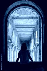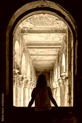 Silhouette of a woman standing at a window, looking into the decaying interior of an abandoned sanatorium in Tskaltubo, Georgia, with peeling turquoise ceilings and classical columns.
