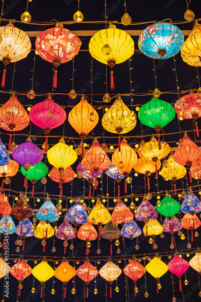 Many beautiful colorful Chinese lanterns hang in the dark night, lighting the street.