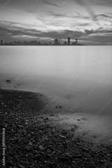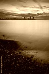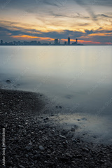 City skyline of Batumi with modern architecture silhouetted against a colorful sunset sky.