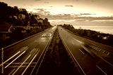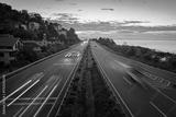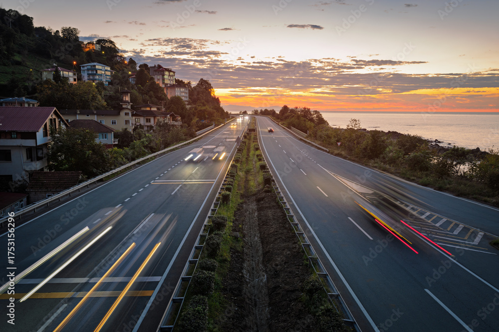 Highway along the sea coast at dusk. Light trails from vehicles. Houses on a hill.