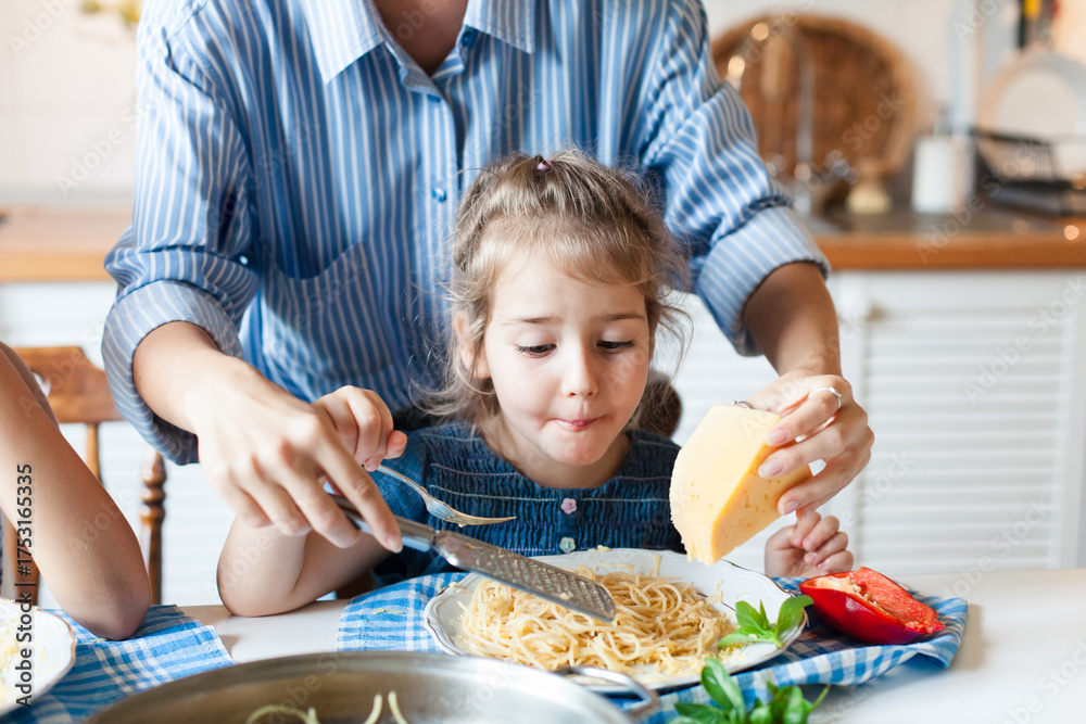 Child girl eating pasta with grated cheese. Mother cooking at home kitchen. Cute kid enjoying delicious family lunch, comfort food, homemade traditional Italian dinner. Authentic candid lifestyle