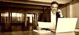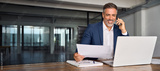 Smiling businessman talking phone, check database in office. Latin or Indian male business man holding documents, working at laptop computer doing online trade market tech research. Banner, copy space