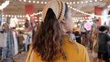 Young Gen Z asia teen female happy travel smile looking at zero waste eco go green buy second hand sale store flea market mall thrift old used vintage fabric retro style. Woman people enjoy youth shop