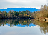 Autumn landscape scene with river, mountains and boat in a quiet factory