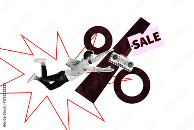 Composite trend artwork sketch image collage of big sale black friday percent discount silhouette young guy fly hold boombox listen music