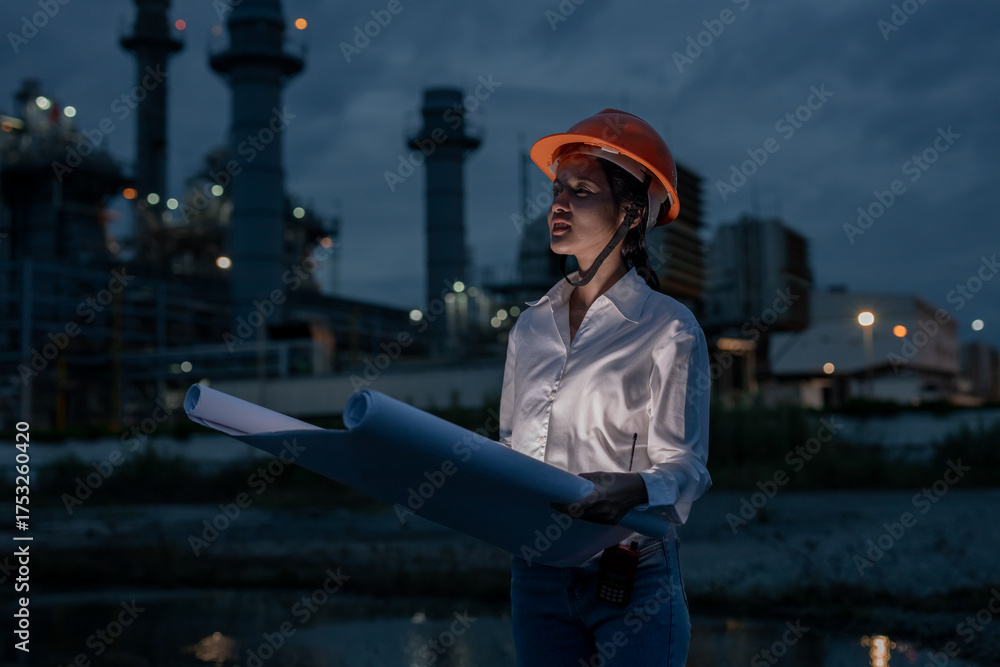 Female industrial engineer wearing safety helmet holding blueprints during night shift at power plant, symbolizing leadership, planning, and diversity in engineering and construction industry.