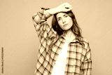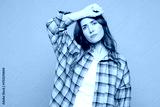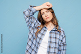 Young sad ill sick exhausted woman she wearing checkered shirt casual clothes put hand on forehead look camera isolated on plain pastel light blue cyan background studio portrait. Lifestyle concept.