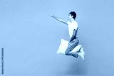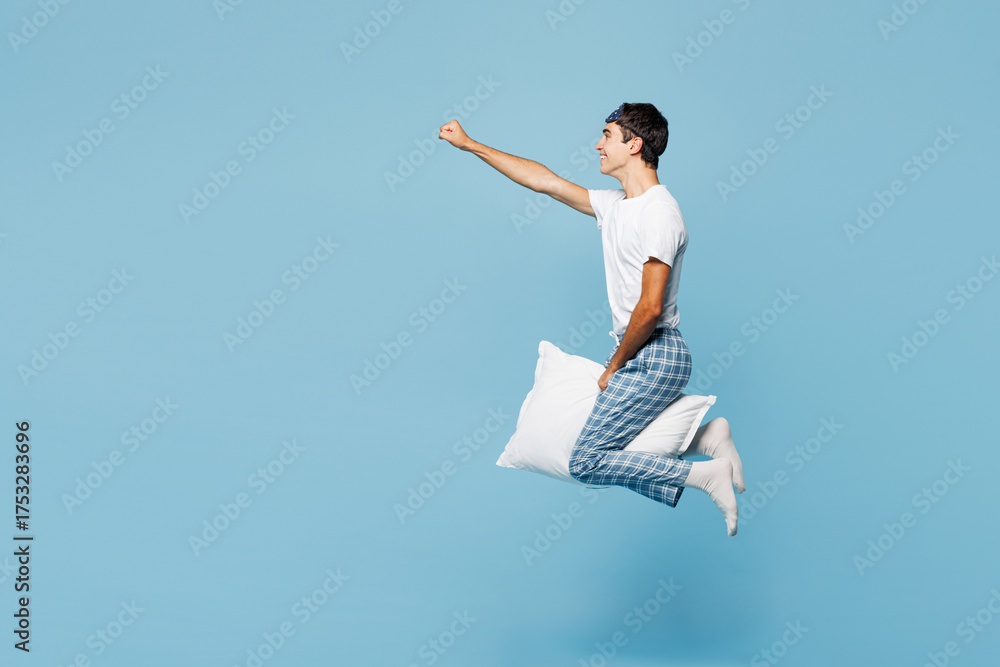 Full body calm young man he wear pyjamas jam sleep eye mask rest relax at home jump high hold pillow pov super hero with riding it isolated on plain light blue background. Good mood night nap concept.