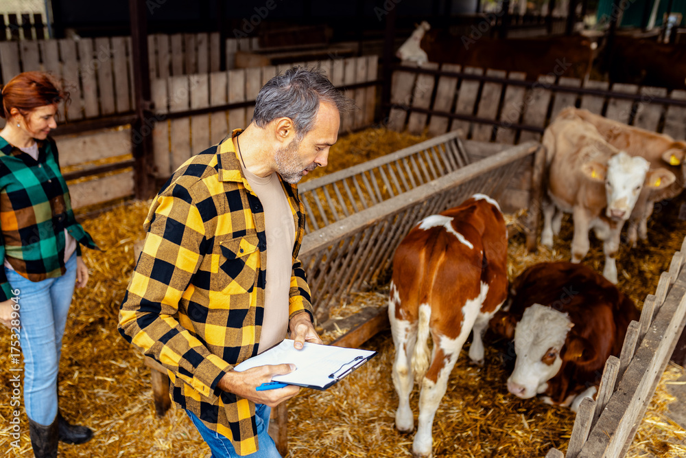 Man and woman working together on a cow farm they take care of the young calves.