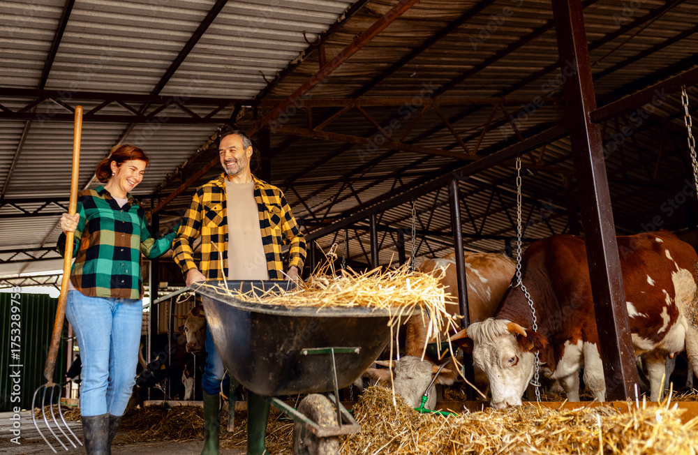 Male and female farmers working together on dairy farm taking care of cows.