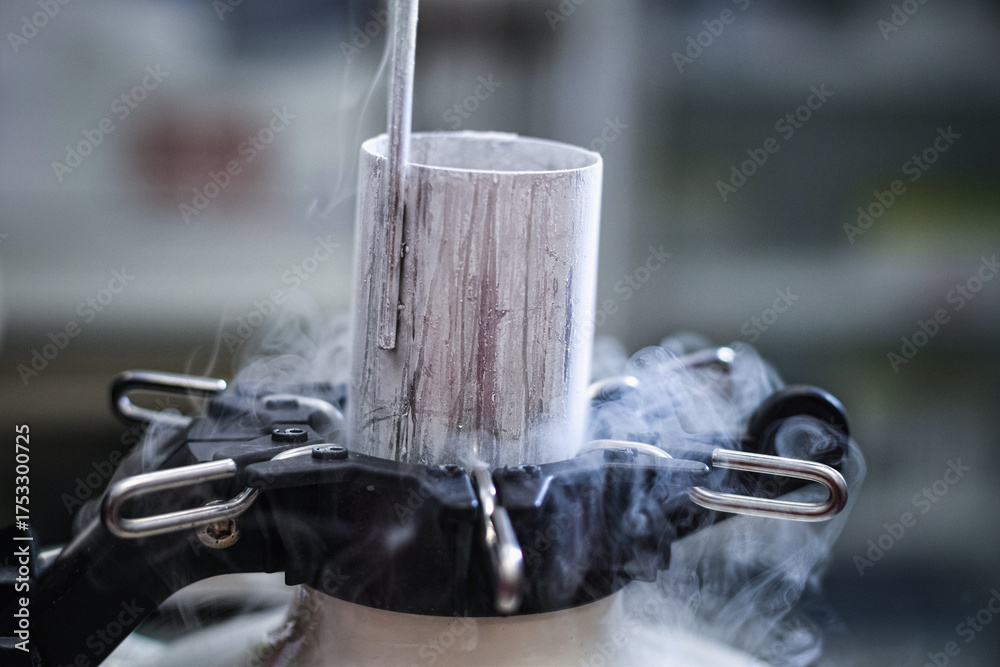 Close-up sperm freezing chamber tank vapor Liquid nitrogen cryogenic storage in laboratory