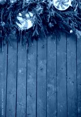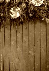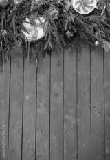 Festive pine garland decorates rustic wooden background with red ornaments