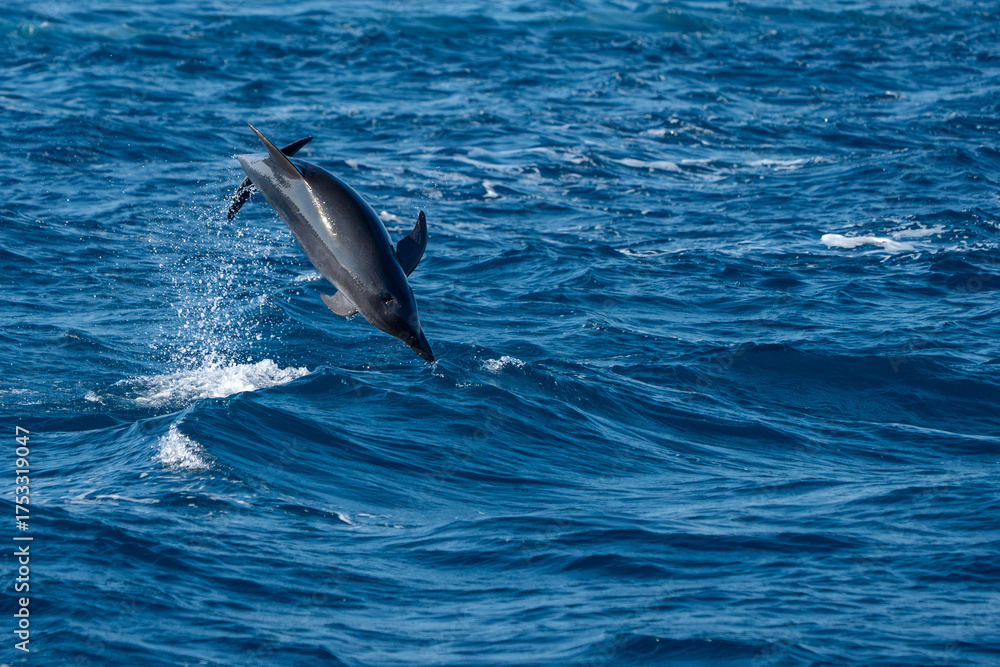 bottlenose dolphins jumping outside the sea out from genoa harbor, mediterranean sea, Liguria Italy