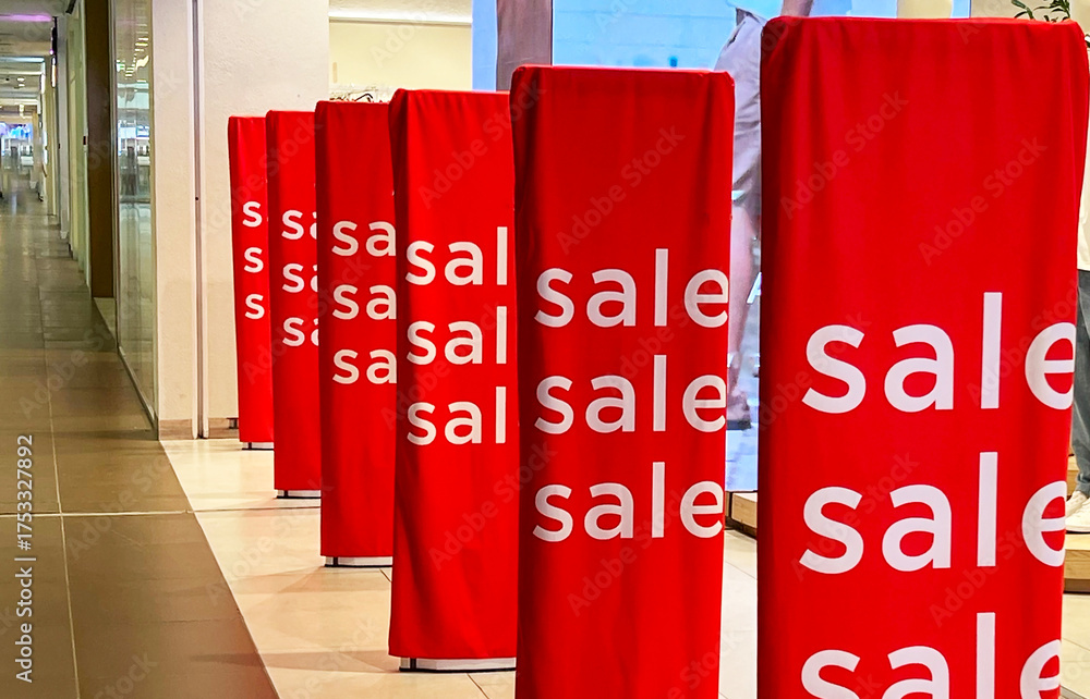 Bright red sale banners attract shoppers in a busy mall