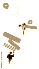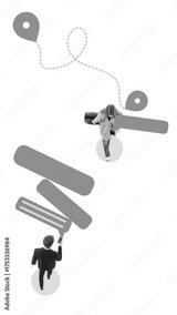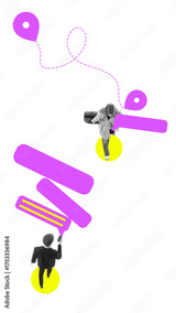 Abstract collage of two people communicating via smartphones with pink chat bubbles and yellow circles. Concept of digital communication, creativity, and online connection in modern life.