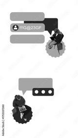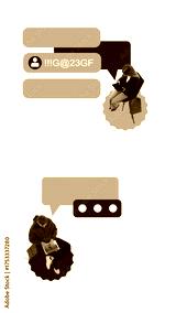 Modern bold poster of two people using laptops with blue and orange message bubbles. Concept of digital chat, social networking, and secure online communication design.