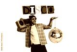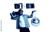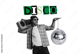 Composite photo collage of happy hipster guy hold retro boombox disco ball party occasion relax isolated on painted background