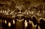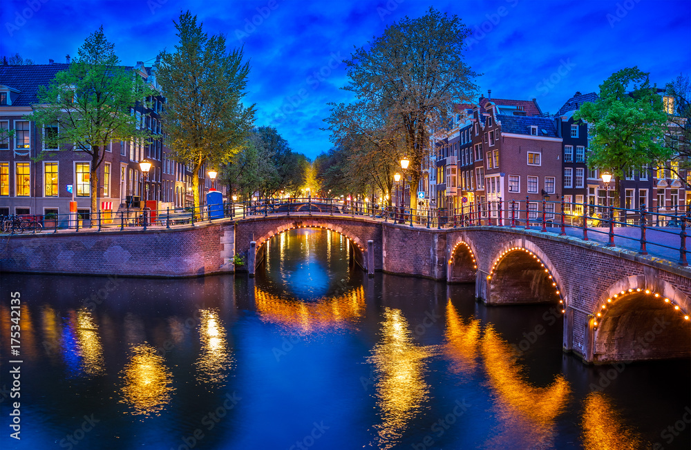 Bridge Blue hour arch over canal in Amsterdam Netherlands.