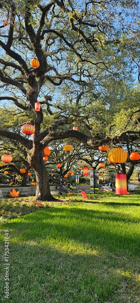 Magical Halloween Time Under the a branchy Tree draped with orange lanterns and leaves