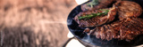 Grilled entrecote steaks with rosemary on charcoal grill, smoke and copy space