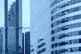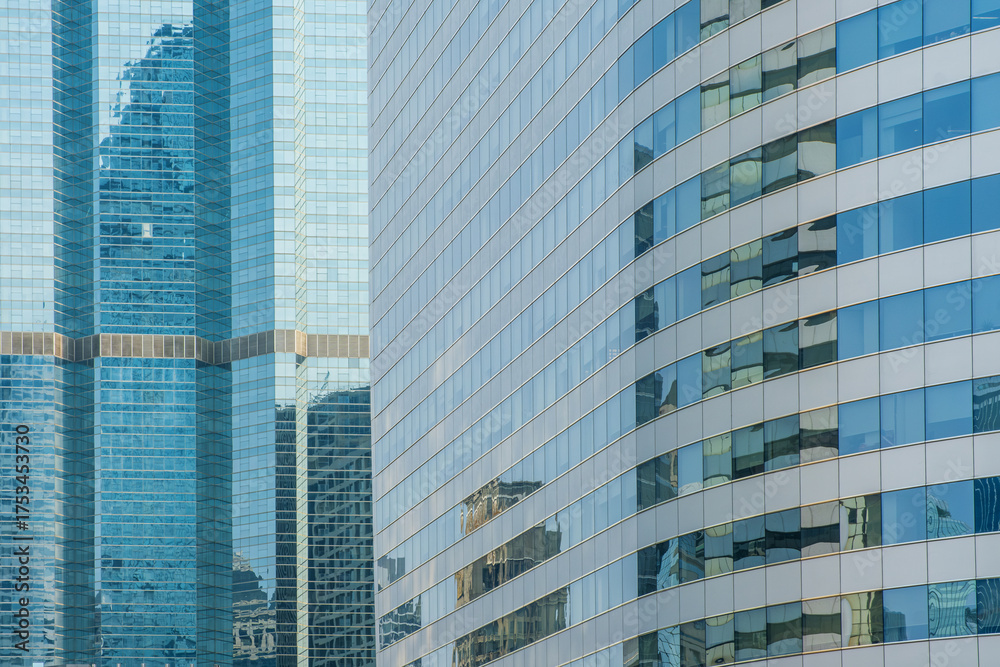 Close up view of modern skyscrapers with curved and reflective glass facades in Bangkok city, Thailand. Abstract architecture background. Modern urban minimalism and geometric abstraction