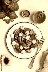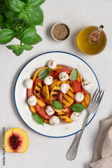 Top view of Caprese salad with grilled peach, fresh tomatoes, mozzarella, and basil on a light background. Summer Italian cuisine concept