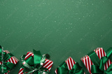 Merry Christmas and Happy Holidays greeting card, frame, banner. New Year. Red white Christmas ornaments and gifts, presents on green background top view. Xmas holiday festive theme.