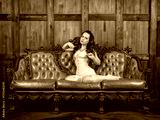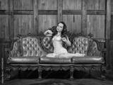 Beautiful sensual woman wears vintage underwear sitting on the brown leather sofa