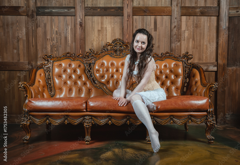 Beautiful sensual woman wears vintage underwear sitting on the brown leather sofa