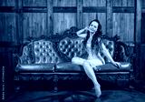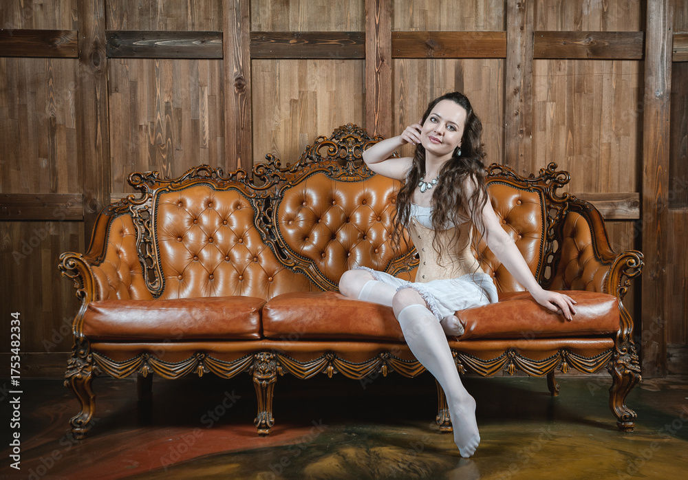 Beautiful sensual woman wears vintage underwear sitting on the brown leather sofa