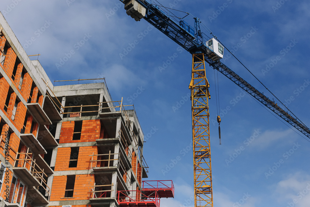 Construction site with crane and unfinished building. Industrial structure development under blue sky. Modern architecture and engineering project symbolizing progress and growth.