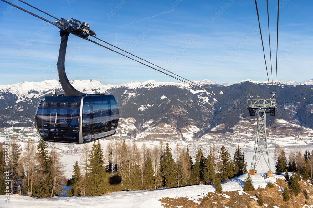 New modern spacious big cabin ski lift gondola against snowcapped forest tree and mountain peaks covered in snow landscape in luxury winter alpine resort. Winter leisure sports, recreation and travel