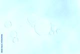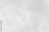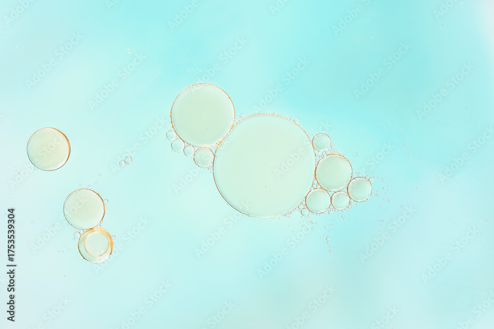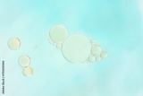 Macro of transparent bubbles of different sizes, floating in water on a soft cyan blue pastel background. Minimalist, clean composition with light gradient. ideal for design or cosmetic concepts.
