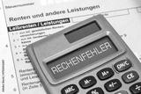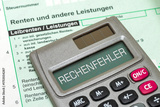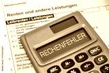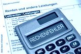 Im Display von einem Taschenrechner über einem Steuerformular steht die Digitalanzeige Rechenfehler als Symbolbild für eine Falschberechnung der Finanzen und Renten - FOTOMONTAGE