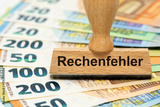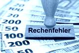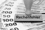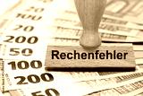 Ein Holzstempel ist beschriftet mit dem Aufdruck Rechenfehler auf vielen Euro Banknoten als Symbolbild für eine Falschberechnung in den Finanzen