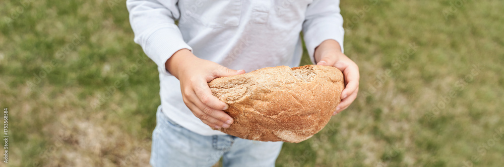 Child holding freshly baked bread outdoors in casual white shirt and jeans.