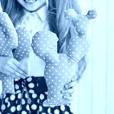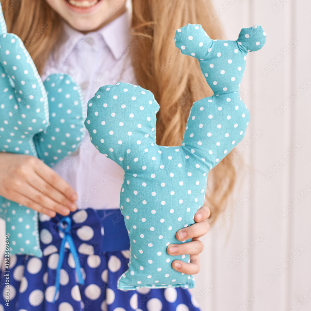 Caucasian young girl holding handmade blue polka dot fabric cactus-shaped toy with joyful smile.