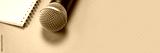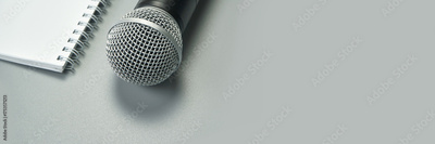 Microphone and notebook on gray background representing music, writing, and creativity concepts.