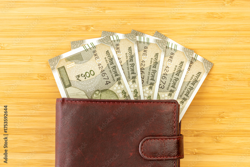 India money. Indian rupees, 500-rupee bills sticking out of a wallet. The currency is INR. Business and financial concept.