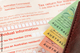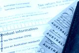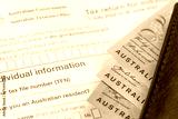 Australian tax return document to fill out and money. Financial concept. Tax settlement, Australian dollars. close up. Business background