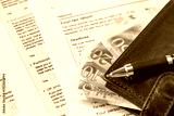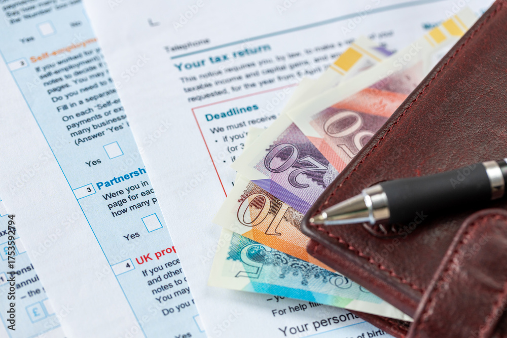 United Kingdom tax settlement. Tax forms. UK money wallet. Financial business concept. Filling out a form. Close up