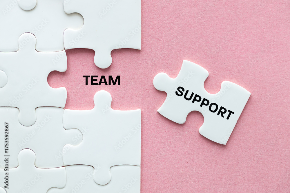 Team support. The puzzle reveals the symbol for Team support. The concept of cooperation in a well chosen team. pink background, copy space